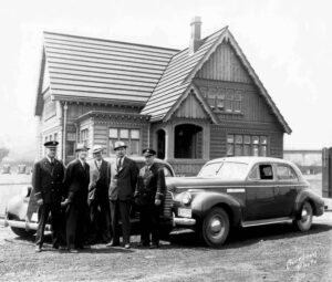 Weyerhaeuser Company executives stand in front of their office building at its second location at Mill Site B, circa 1940s.
